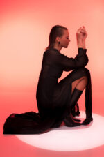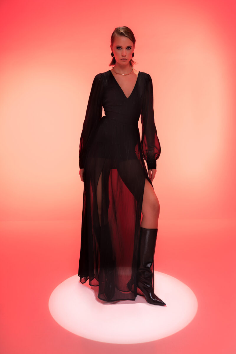 Sheer long-sleeve gown with deep V-neckline and high slit. Elegant, fluid and subtly sensual.