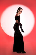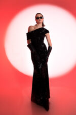 Velvet sequin gown with an asymmetric off-shoulder neckline and sculped fit.Bold, elegant and designed to command attention.