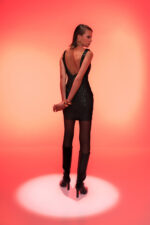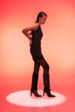 Elegant and contemporary, this mini sequin dress is crafted in deep olive green shade with subtle metalic shine. Featuring a clean front and deep back, it’s a bold statement for evening looks with refined edge.