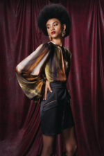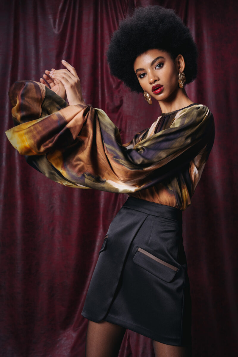 The blouse is an elegant piece.It features a round neckline with gentle ruching that adds texture and a touch of sophistication. The long, billowy sleeves are slightly voluminous, ending in gathered cuffs that create a subtle puffed effect, enhancing the flowy and airy silhouette of the blouse.