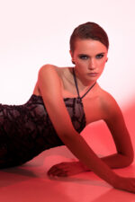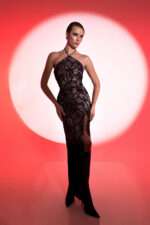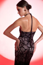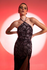 Sequin-emroifered halter gown with sculpted fit,high slit and open back. Elegant and confidently bold.