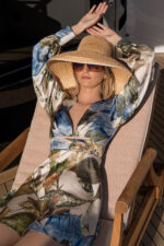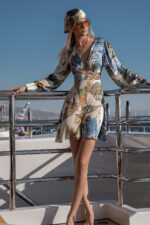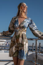Make a statement in this luxurious satin mini dress featiring a vibrant nature-inspired print. With long puff sleeves, a flattering V-neckline,and a subtle cut-out at the waist,it blends elegance with a playful touch. Perfect for sunny escapes!