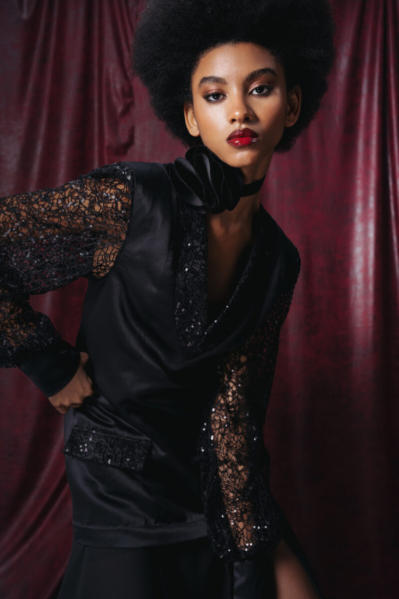 This striking black dress combines both structure and elegance. The bodice features a fitted silhouette with a deep V-neckline and subtle sequin embellishments, lending a hint of sparkle. The long sleeves are crafted from intricate lace with sequin accents, creating a textured, semi-sheer effect that adds a dramatic touch. The waist includes decorative pocket flaps with matching sequins for added detail.