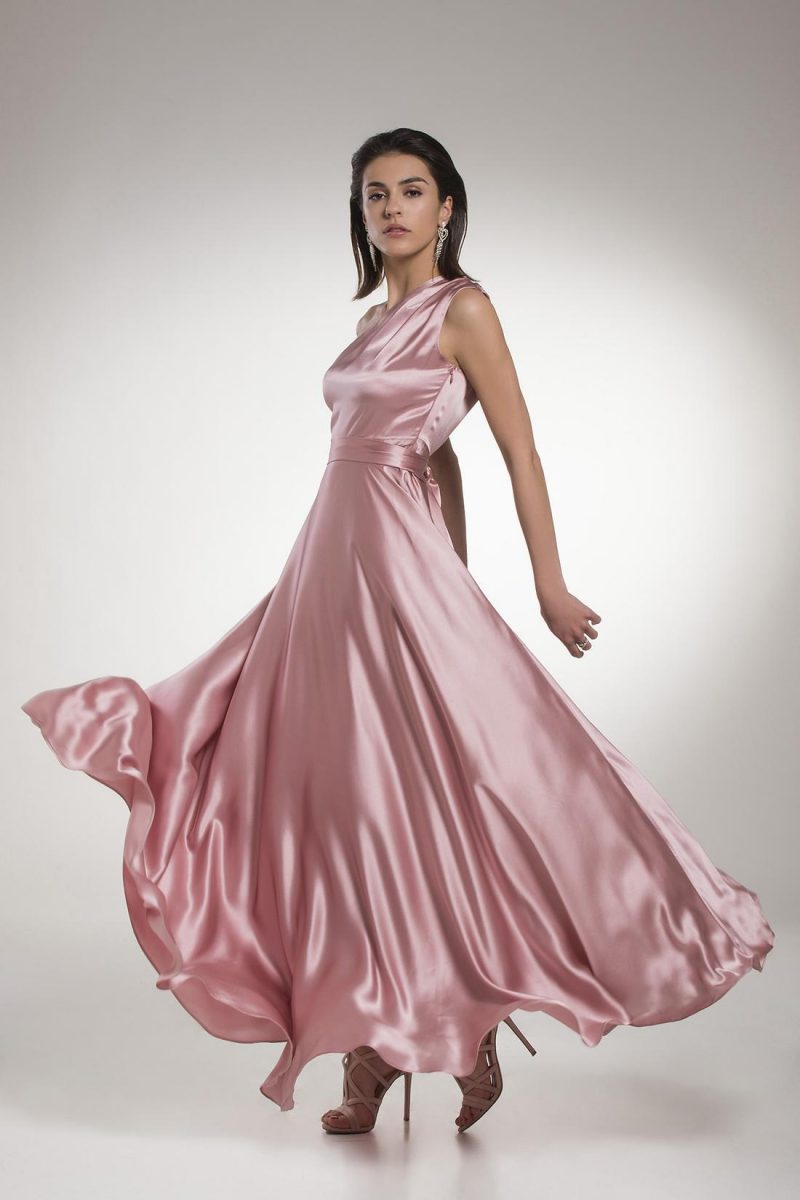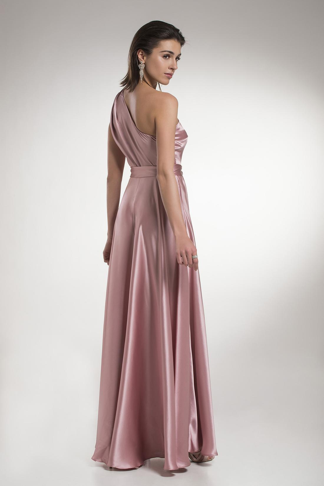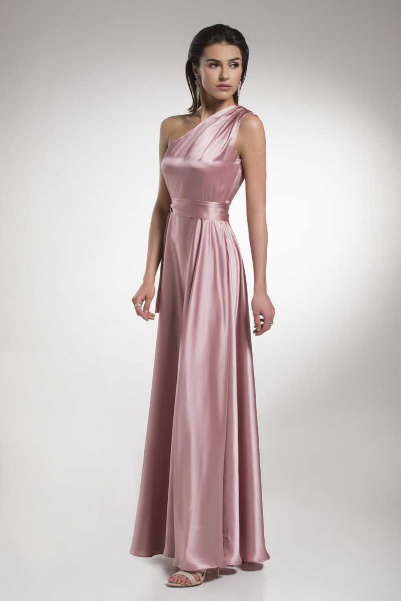 Μάξι μεταξωτό φόρεμα με σούρα στον ώμο και ζώνη