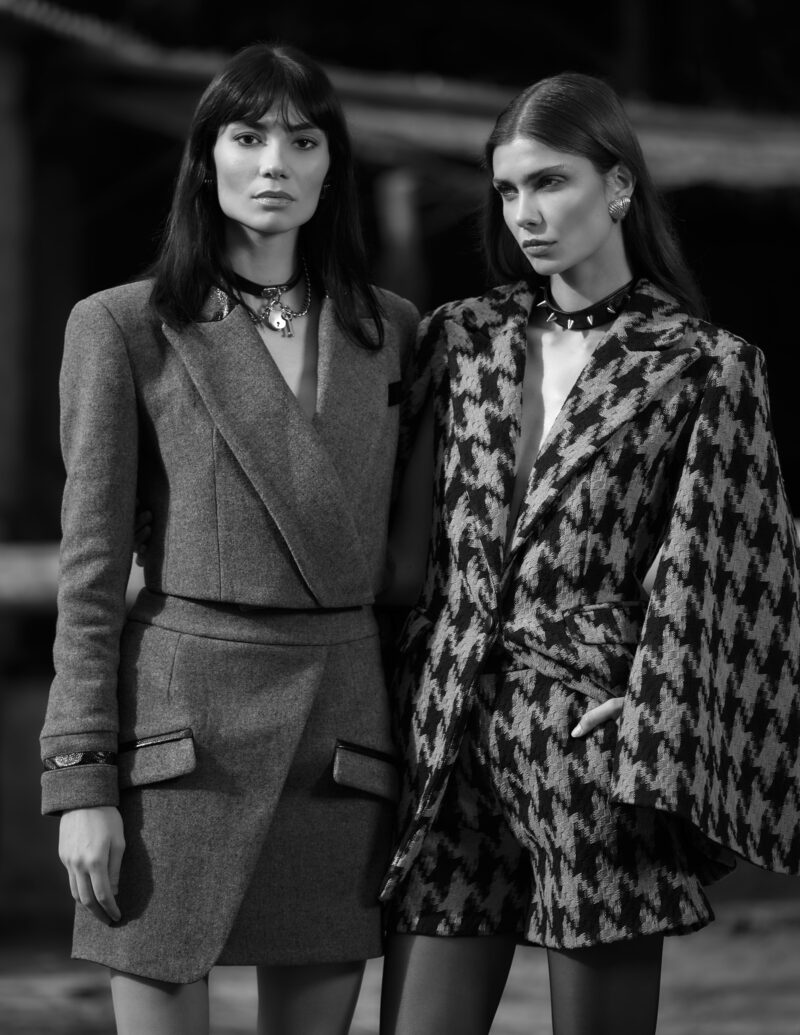 Melanie is a wool pied de poule blazer with open sleeves. The wool fabric would provide warmth, the pied de poule pattern would add a refined look, and the open sleeves could introduce a modern and distinctive flair to the design.