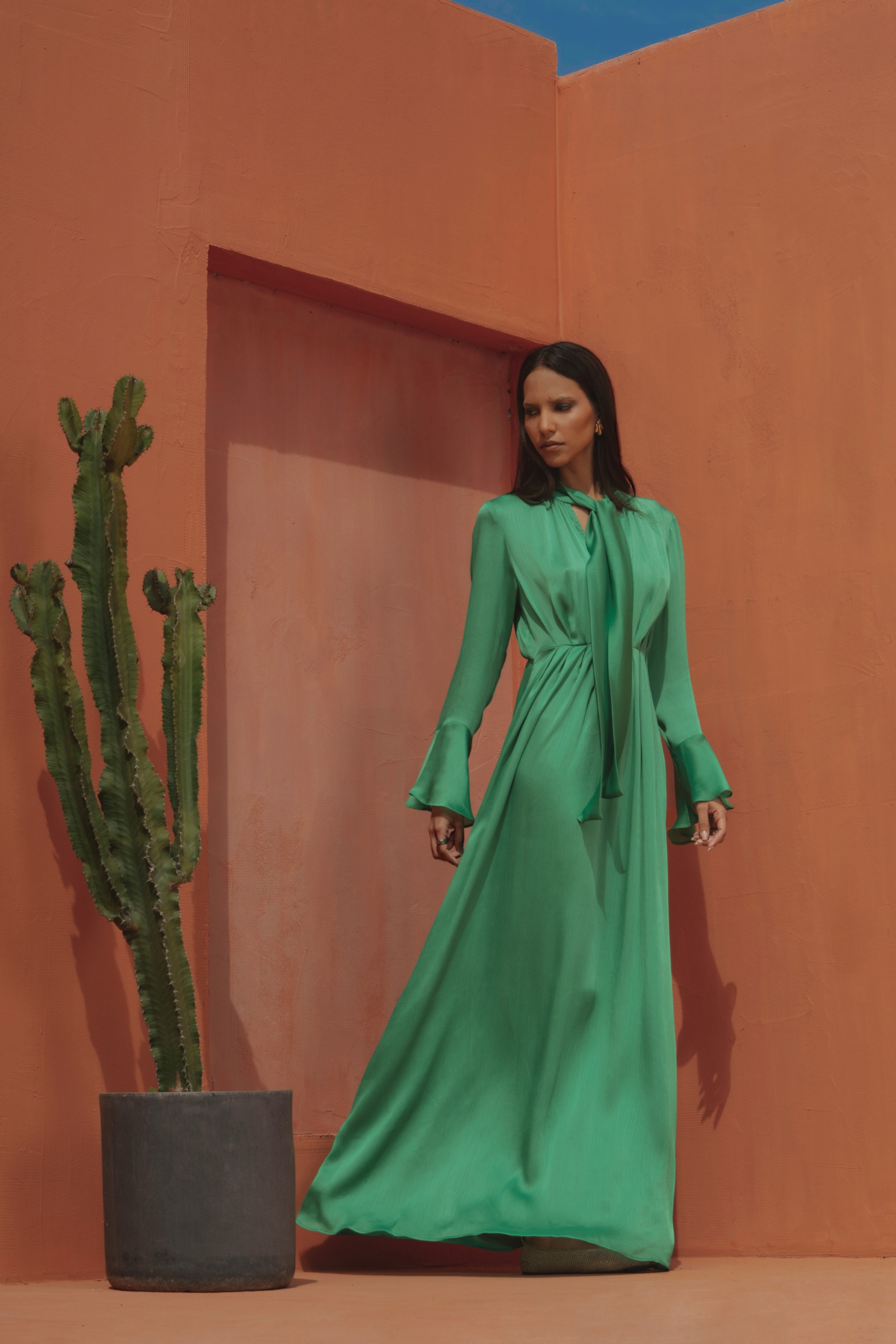 Mona dress crafted from soft chiffon, V- neckline with an adjustable self-tie neck detail. Long sleeved finished with flared cuff details and pleated accents throuhout add soft movement.