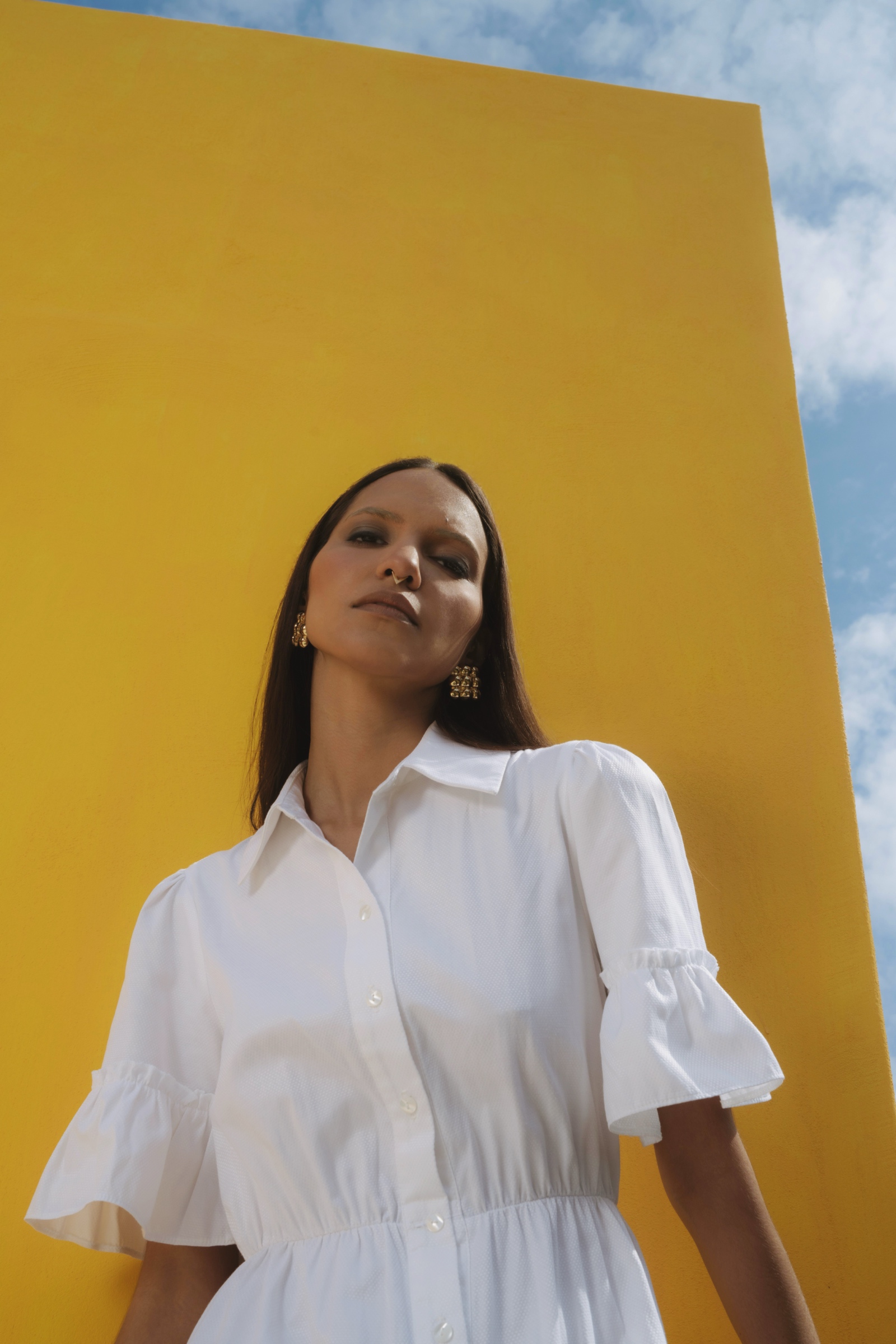 Maxi dress with short sleeves and a classic collar. Designed with front button closure, soft ruffle at the sleeves and a subtle ruffle at the bottom.