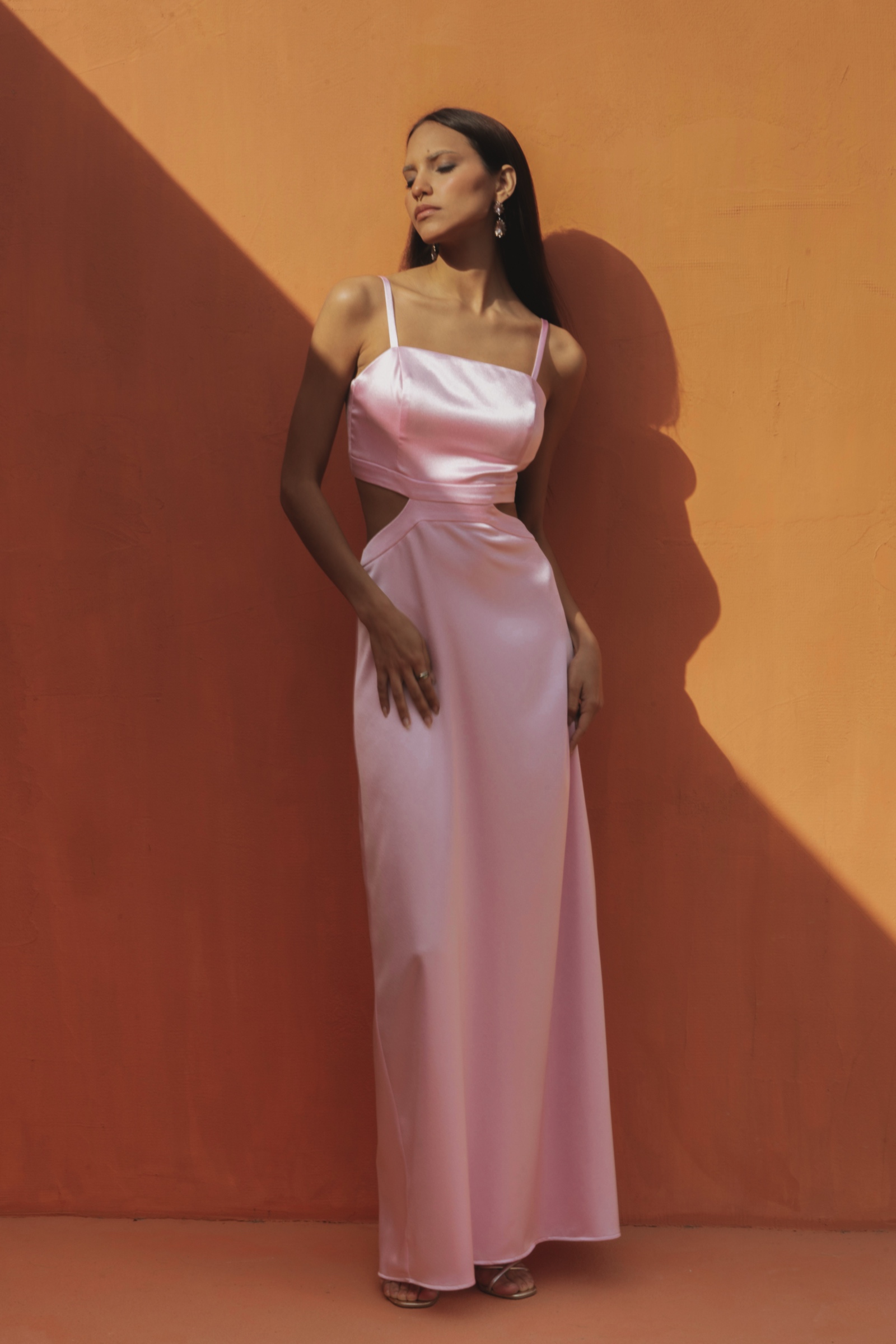 Sally dress crafted from smooth satin, featuring delicate straps and structured bodice. Cut-out details at the waist extend the open back, where the design ties elegantly. The long skirt is finished with a back slit, adding movement and a refined touch.