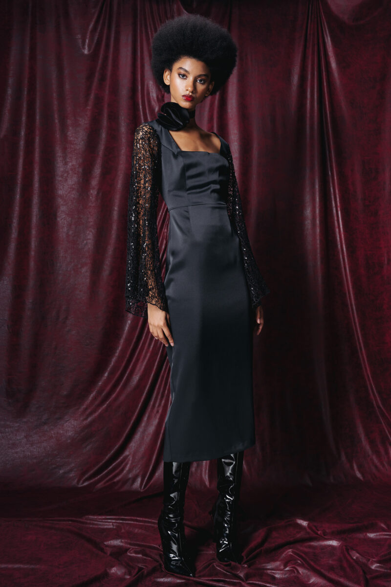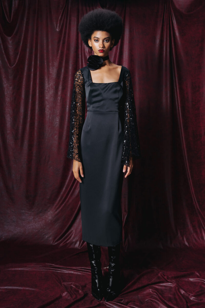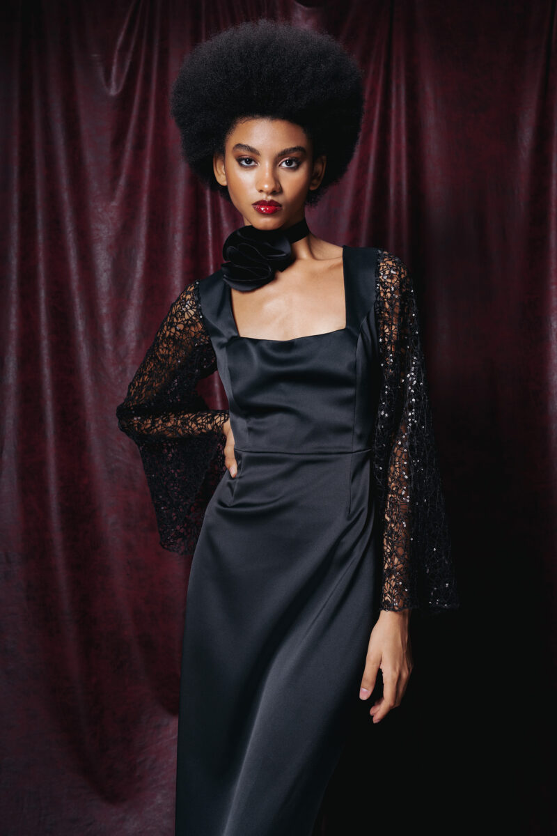 This elegant black dress features a sleek, form-fitting silhouette with a square neckline that adds a touch of modernity. The standout elements are the long, semi-sheer lace sleeves adorned with subtle sequins, providing a delicate and sophisticated contrast.