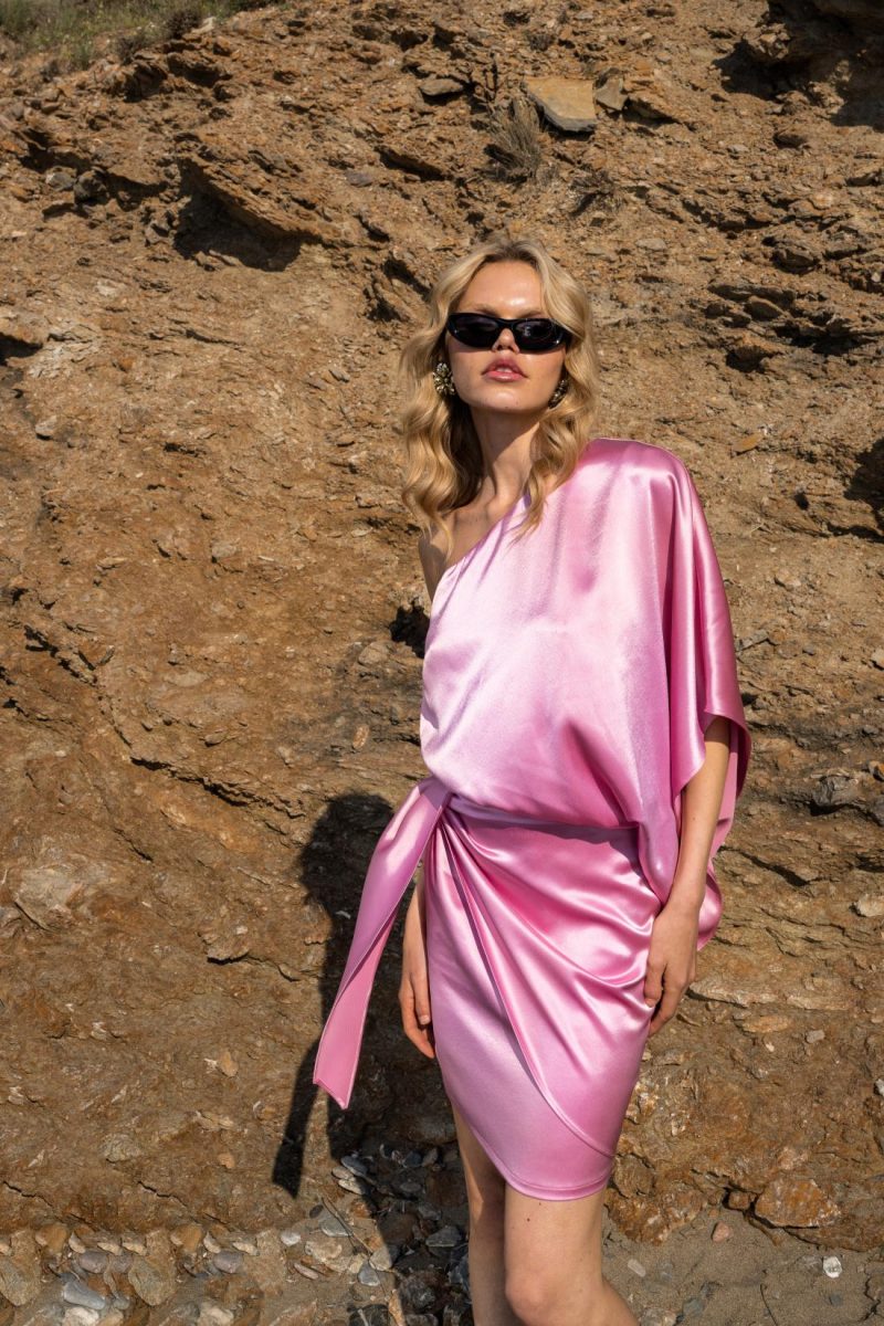 Aria is a one-shoulder satin dress. It is made from a luxurious and smooth satin fabric that gives it a beautiful sheen and a glamorous look.
