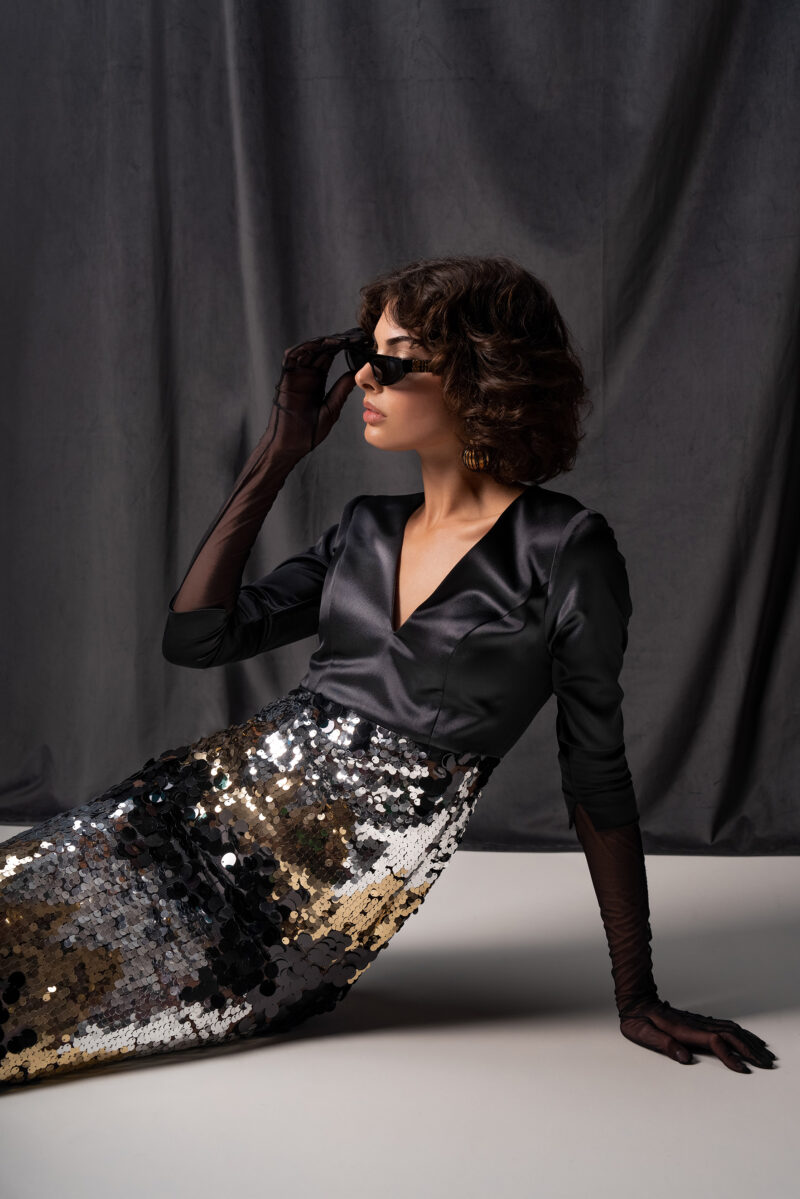 This dress features a sleek black, 3/4 sleeve bodice with a V-neckline paired with a high-waisted, floor-length skirt adorned with shimmering black, silver, and gold sequins in a stunning gradient effect. The fitted silhouette and dramatic flare exude elegance and modern glamour, perfect for a statement evening look.